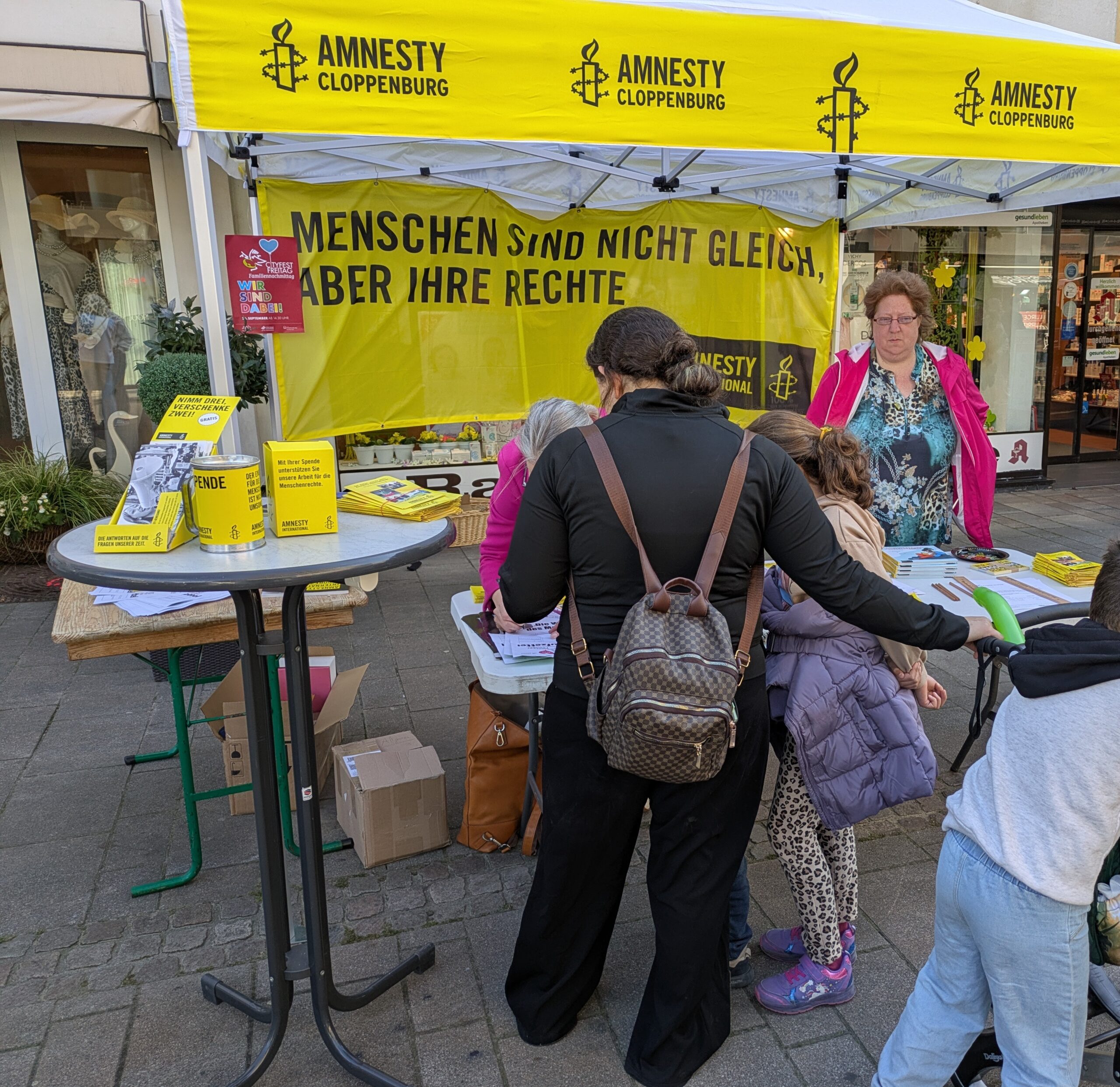 Am Freitag fand ein bunter Familientag auf dem Cityfest in Cloppenburg statt. Auch unsere Gruppe hatte einen Stadt aufgebaut, der von vielen Kindern belagert wurde, die einen Stempel für das Quiz brauchten. Deren Eltern konnten wir derweilen über unsere Arbeit aufklären und Unterschriften für Sulaimon Olufemi sammeln, einen Nigerianer, der seit über 20 Jahren in Saudi-Arabien in der Todeszelle sitzt, nachdem er in einem unfairen Verfahren zum Tod verurteilt wurde.